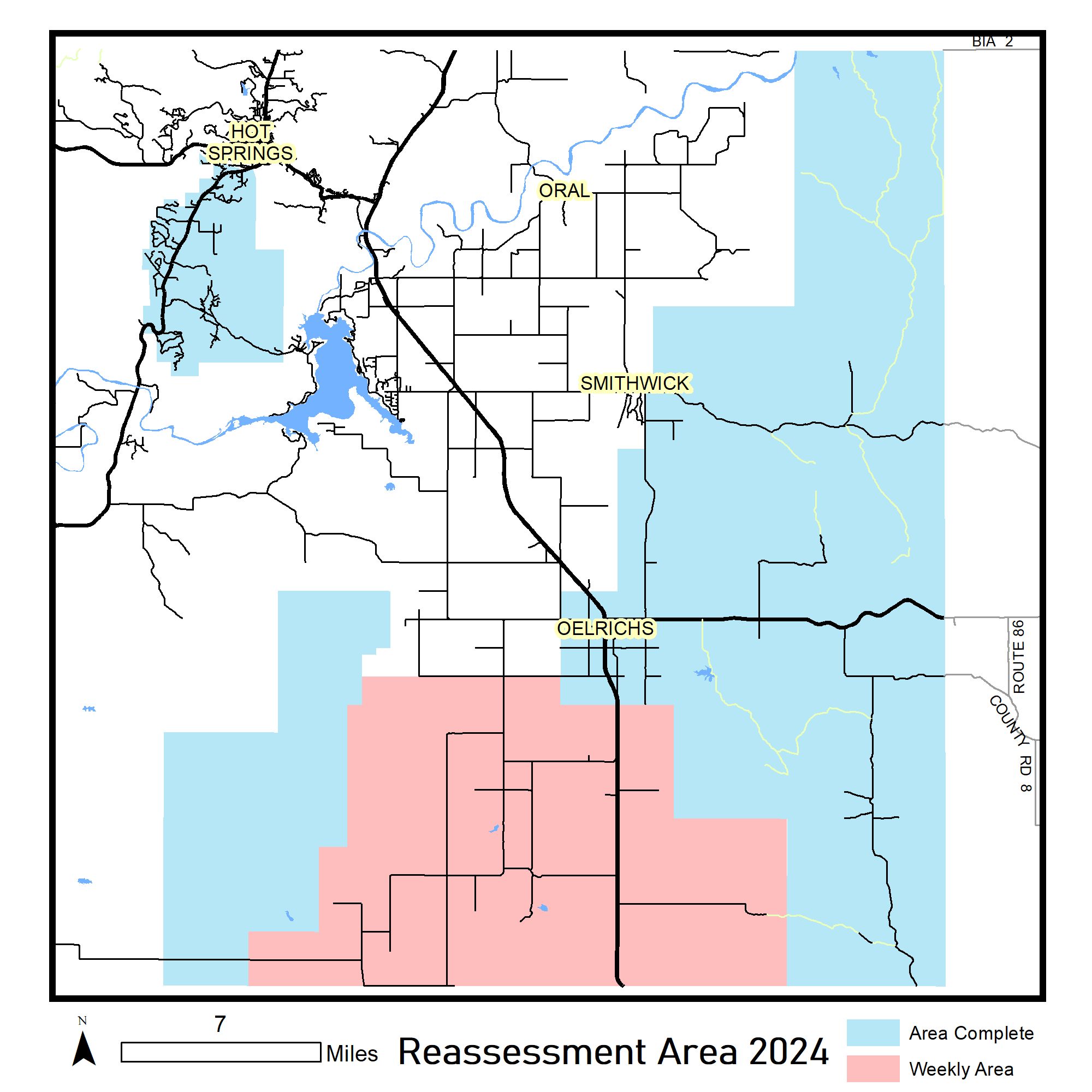 Map of reassessment area for 2024 project showing areas done and to be completed.